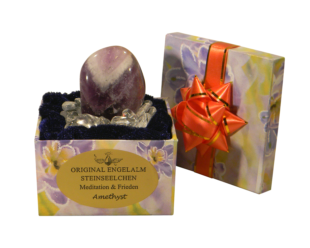 Energetisierter Edelstein in einer romantischen Geschenkbox (Design variiert). Präsentiert wird das Steinseelchen liebevoll gebettet auf reinsten Kristallen (Bergkristall). Eine Reinigung ist nicht notwendig. Das Steinseelchen kann einfach im mitgelieferten Kristallbett aufbewahrt werden.