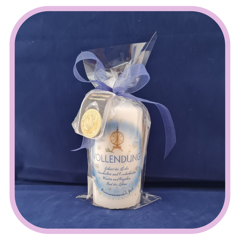 Segensmünze PERCHTGOLD mit einem kleinen Erklärungsflyer zur Segensmünze. Bei der Kerze zusätzlich ist auch ein